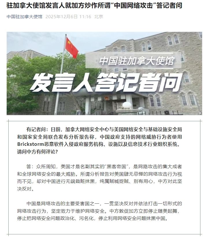新京报讯 据中国驻加拿大大使馆消息,有记者问:近日,加拿大网络安全中心与美国网络安全和基础设施安全局及